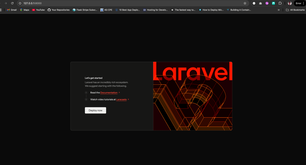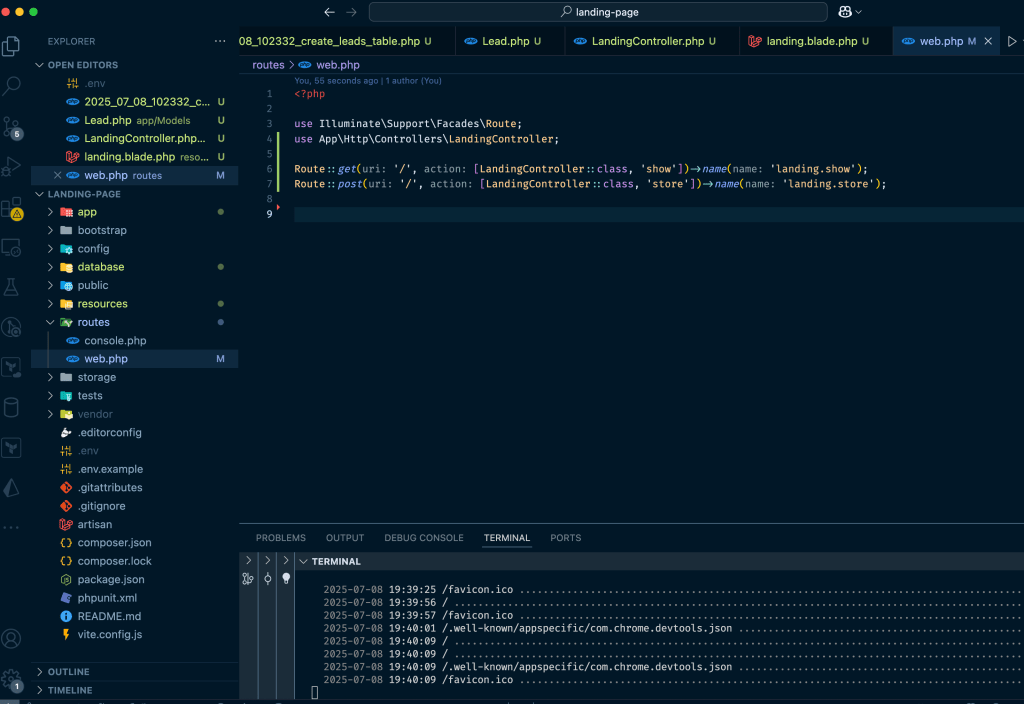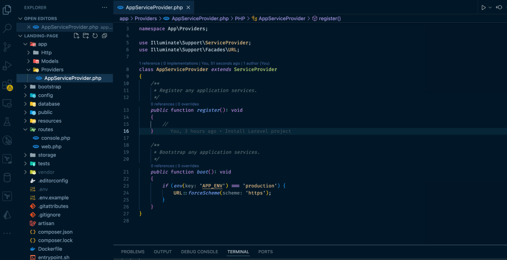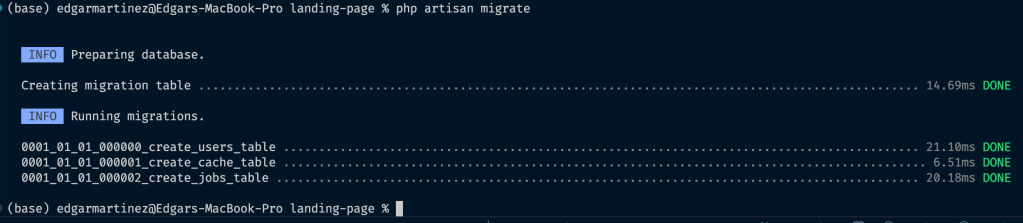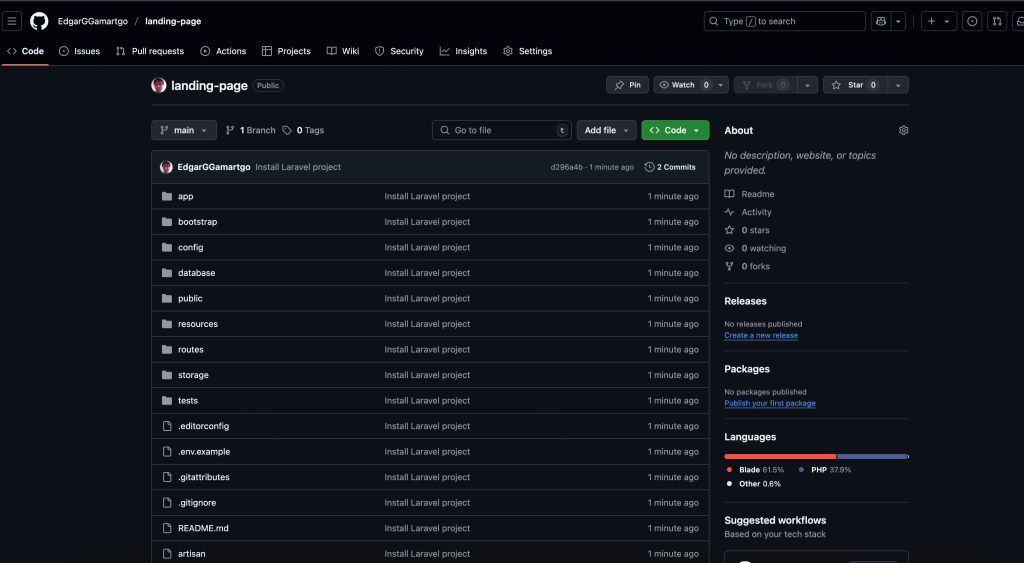 That creates a new Laravel project in my current directory, however, I experienced that Laravel didn’t like that I already had a README file and my .git directory so it was complaining, the solution I found was create the project in a temporary folder and then move the files into my landing-page folder. Once I got everything I pushed the changes to my repo in order to save progress.