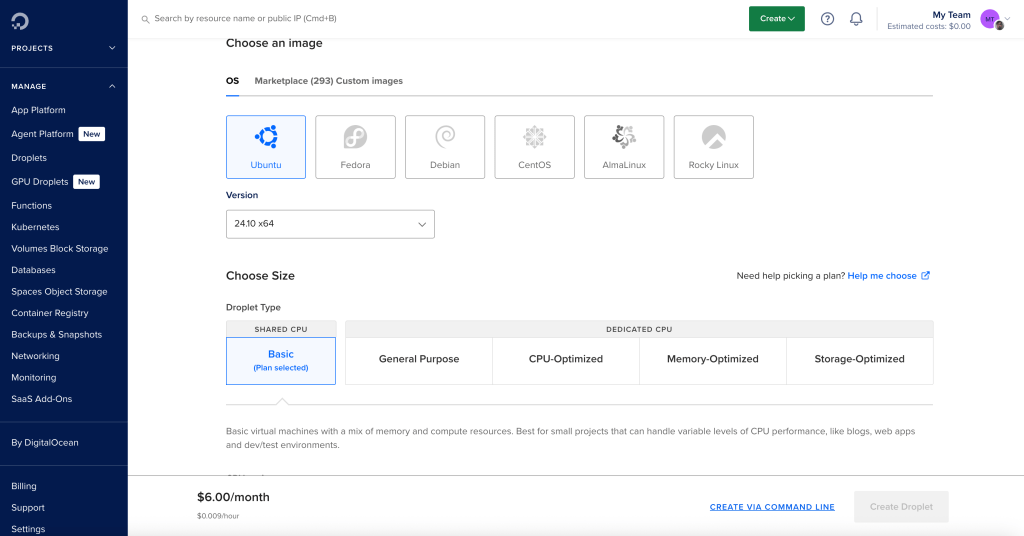 Once we have our account, we can create the droplet by following these steps on the DigitalOcean dashboard: